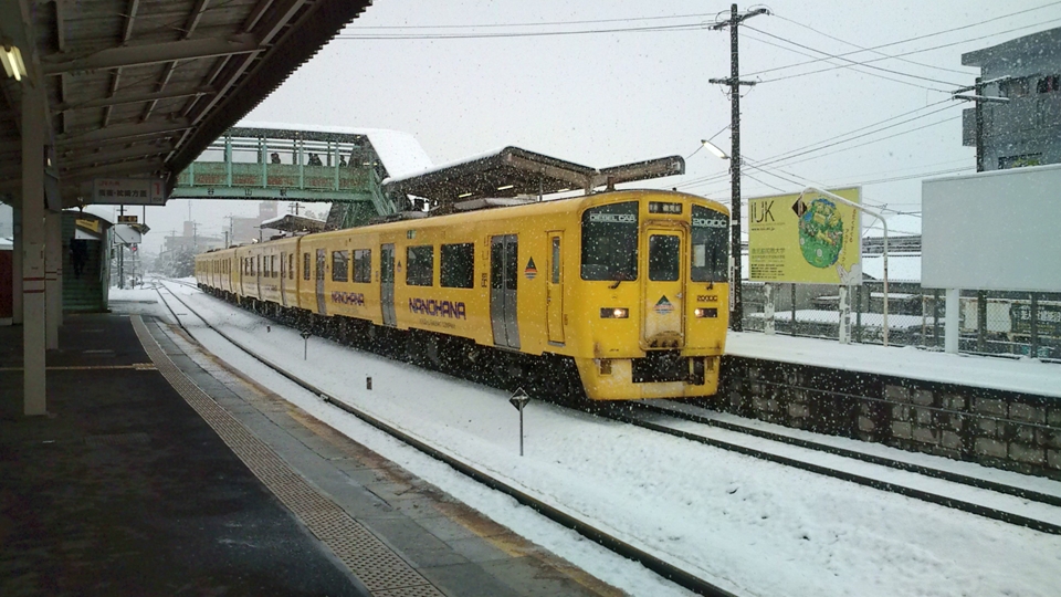 雪が舞い散る中、列車は順調に進み、谷山駅へ。