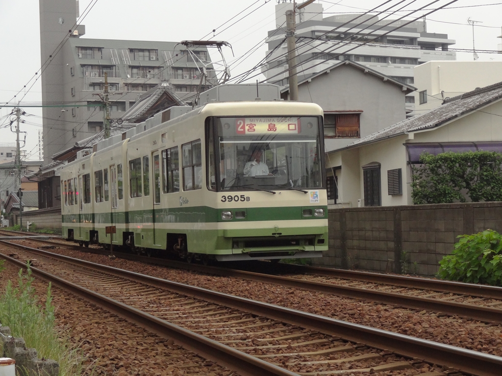 1900形は千田にも江波にも配置されており、800形や700形と違い白島線にも入るので、2号線以外の全ての系統の運用に入る唯一の単車です。